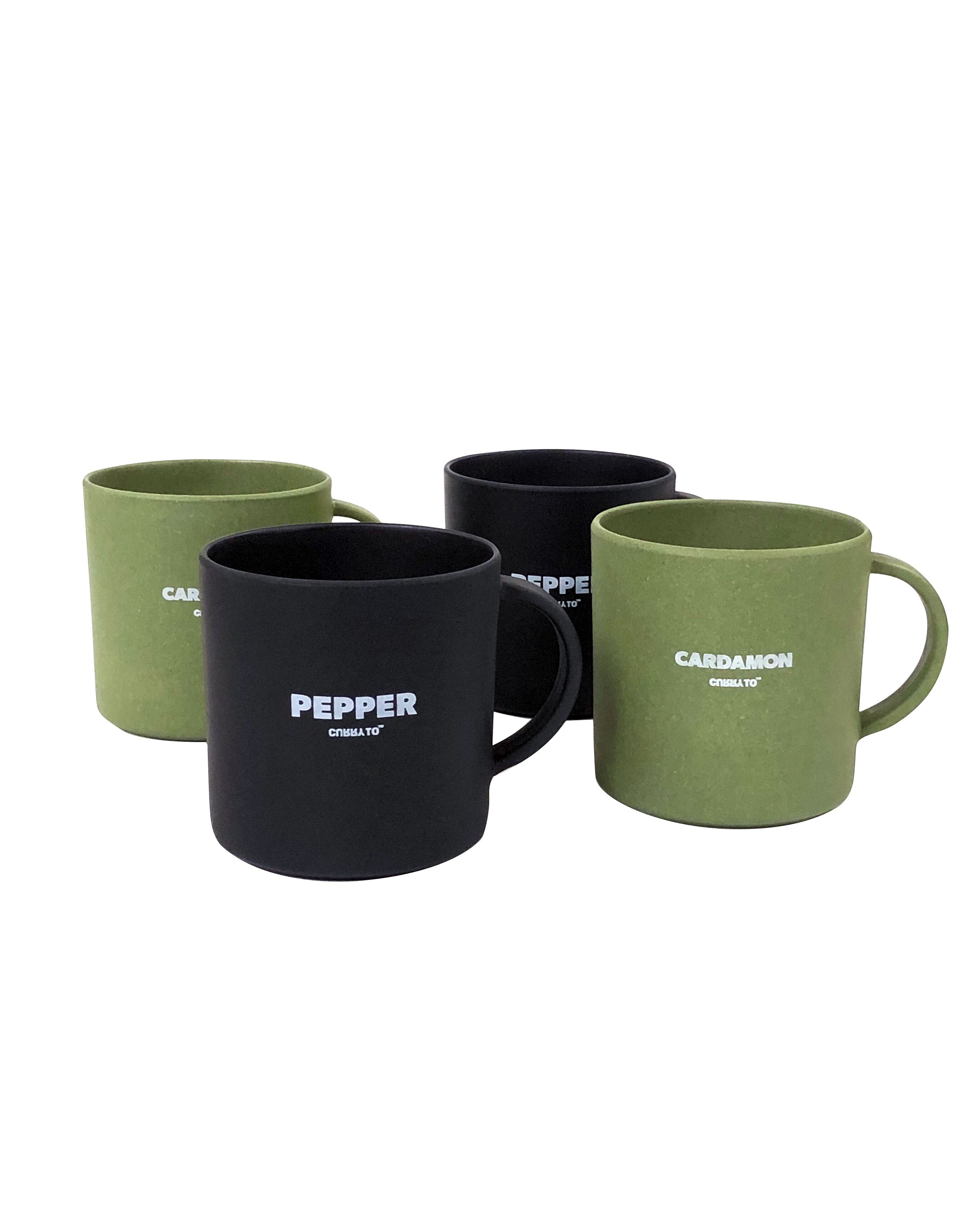 環境に優しいサステナブルな素材のカップにスパイスの色を彷彿させるプリントをしています。